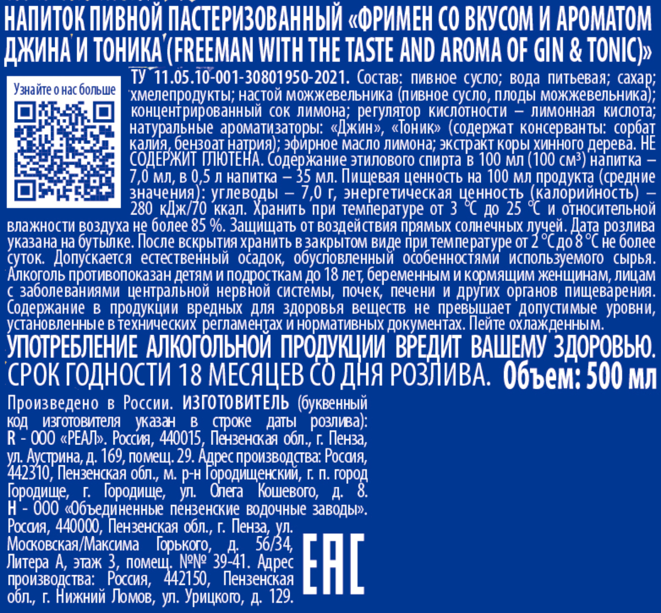 Напиток пивной Фримен Джин тоник пэт 0,5 л