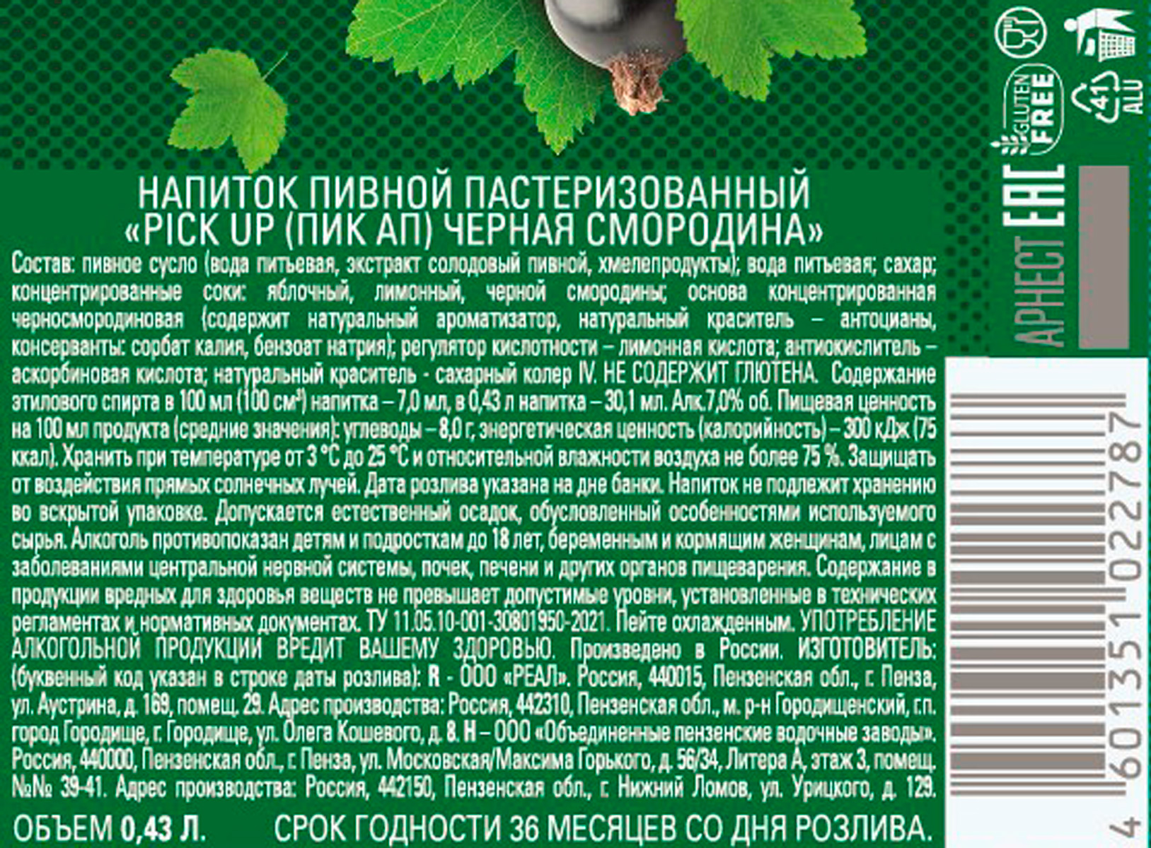 Напиток пивной Пик Ап черная смородина ж/б 0,43 л