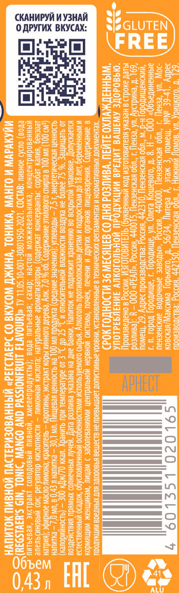 Напиток пивной Регстаерс джин тоник манго маракуйя 0,43 л