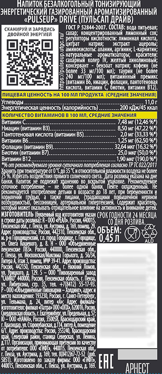 Энергетический напиток Пульсап Драйв ж/б 0,45 л