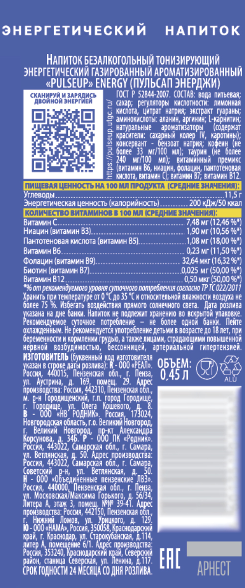 Энергетический напиток Пульсап Энерджи ж/б 0,45 л