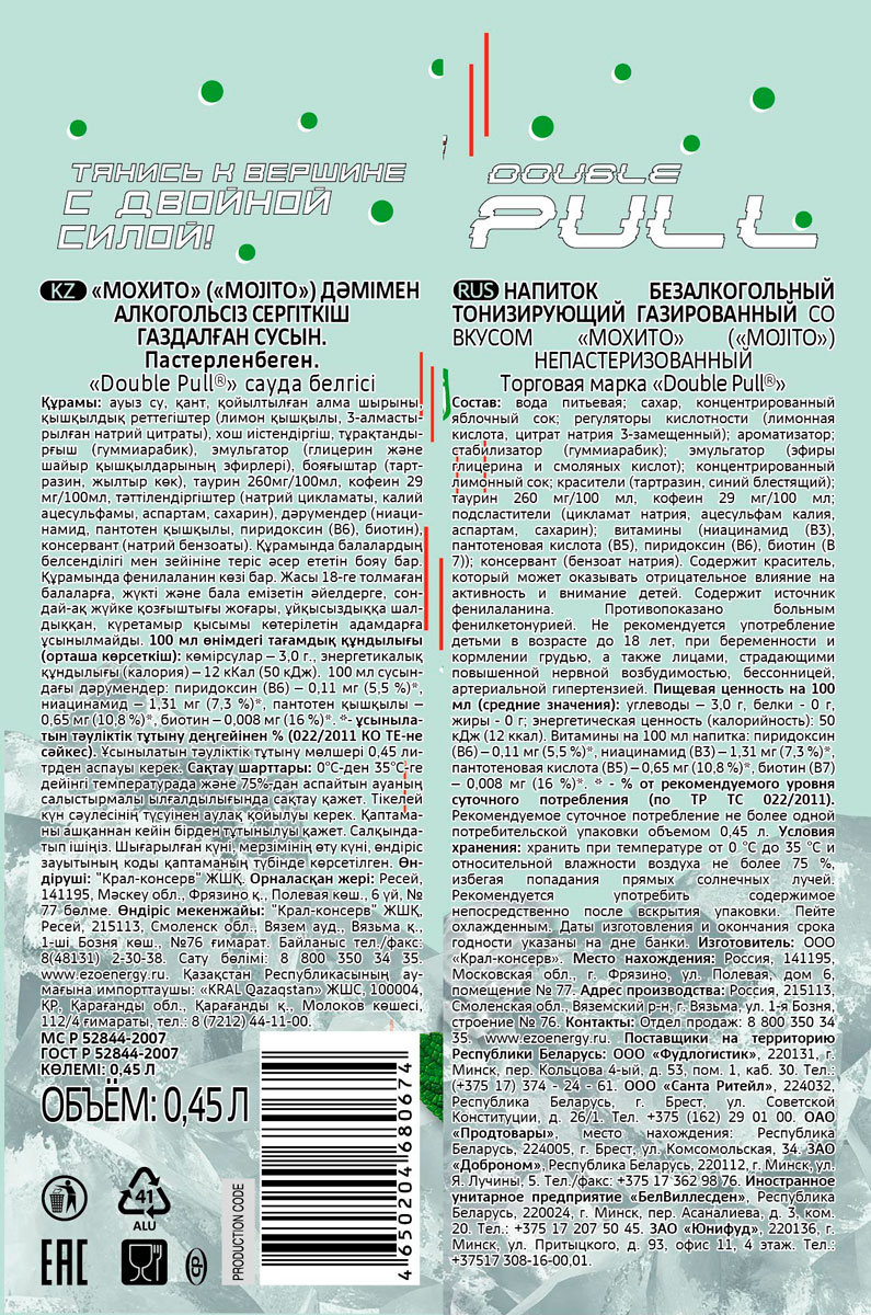 Тонизирующий напиток Double Pull Мохито ж/б 0,45 л