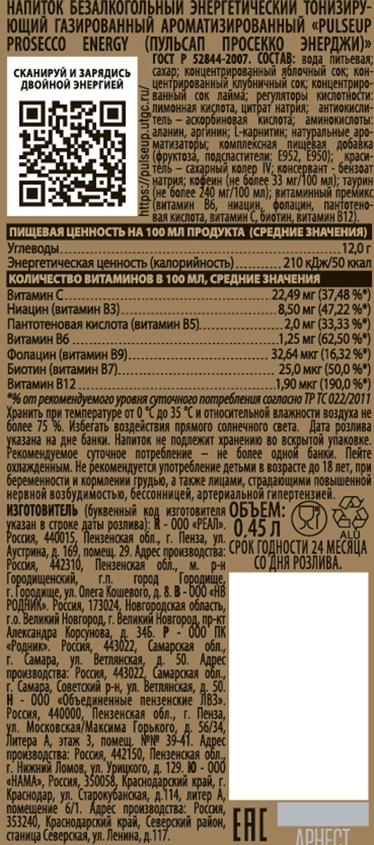 Энергетический напиток Пульсап Просекко Энерджи ж/б 0,45 л