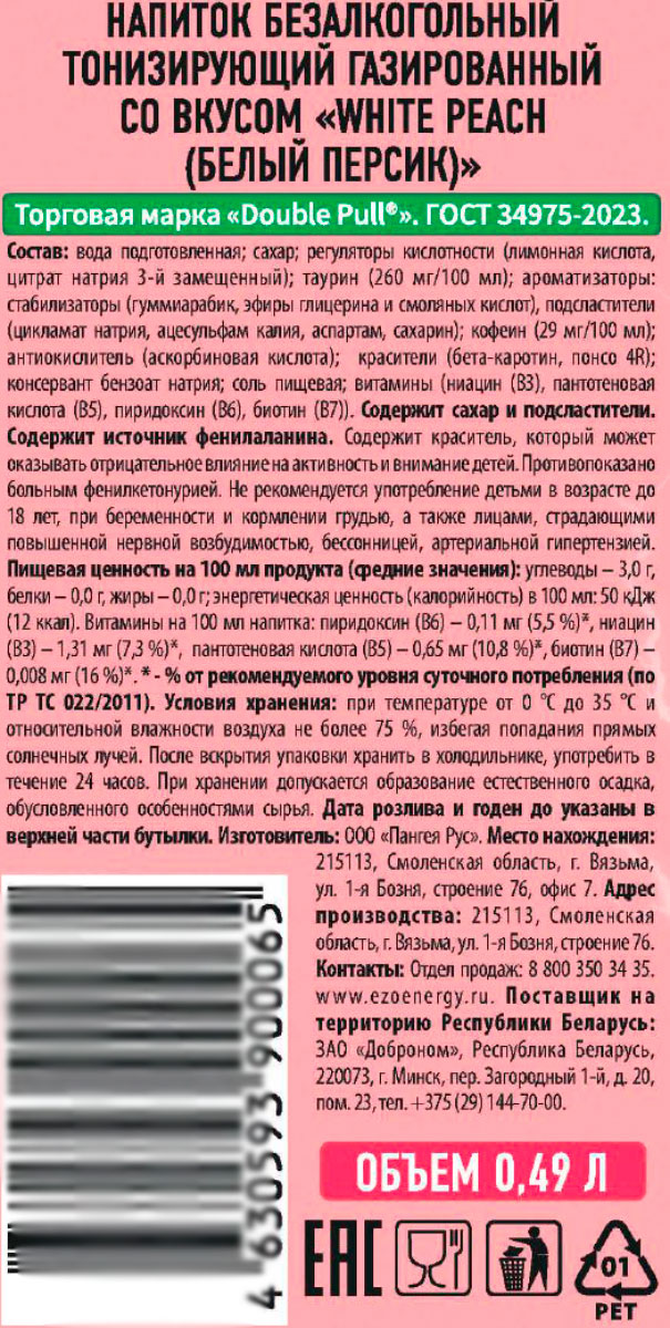 Тонизирующий напиток Double Pull Белый персик 0,49 л