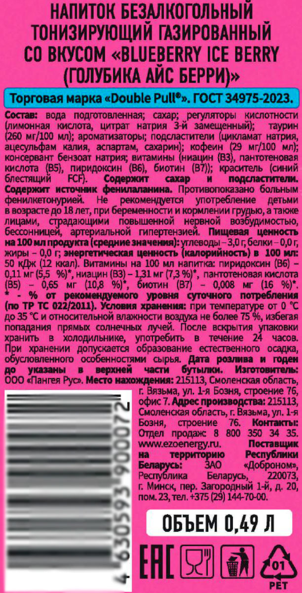 Тонизирующий напиток Double Pull Голубика Айс берри 0,49 л