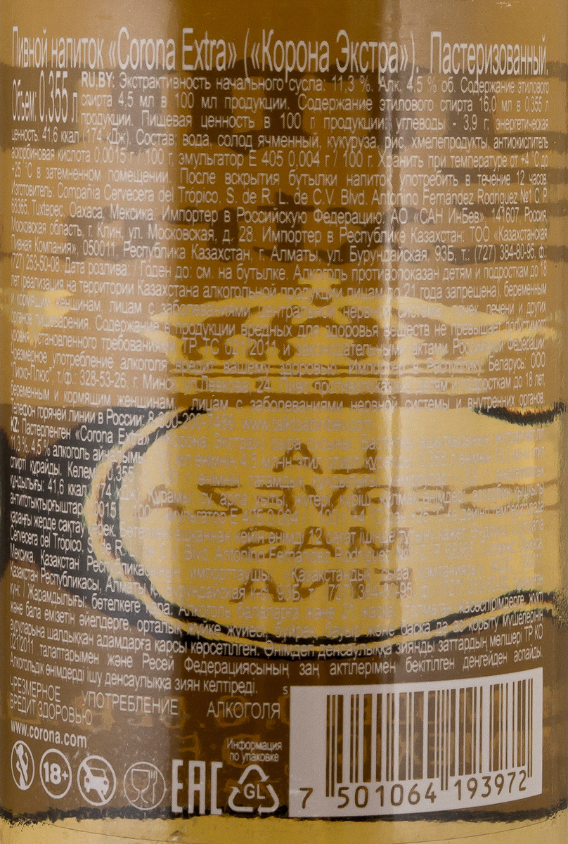 Напиток пивной Корона Экстра светлое пастеризованное ст 0,355 л