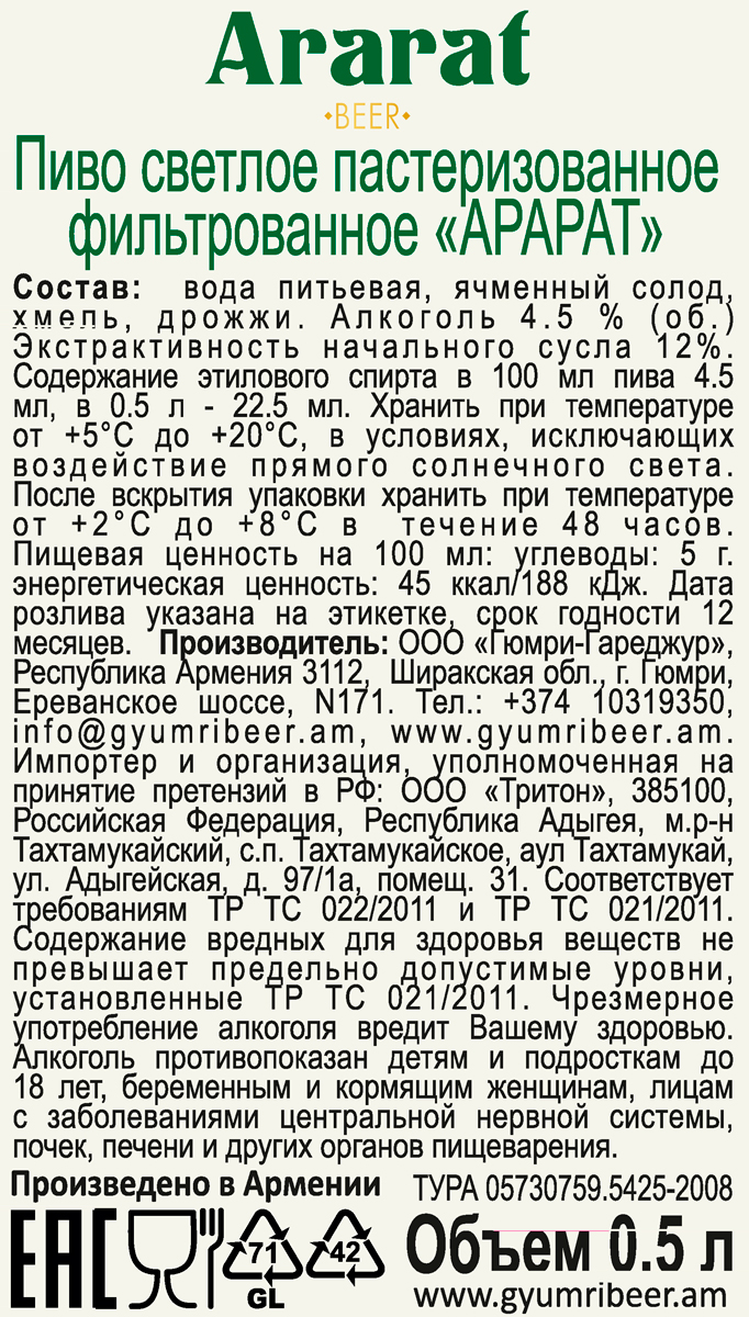 Пиво Арарат светлое фильтрованное пастеризованное ст 0,5 л