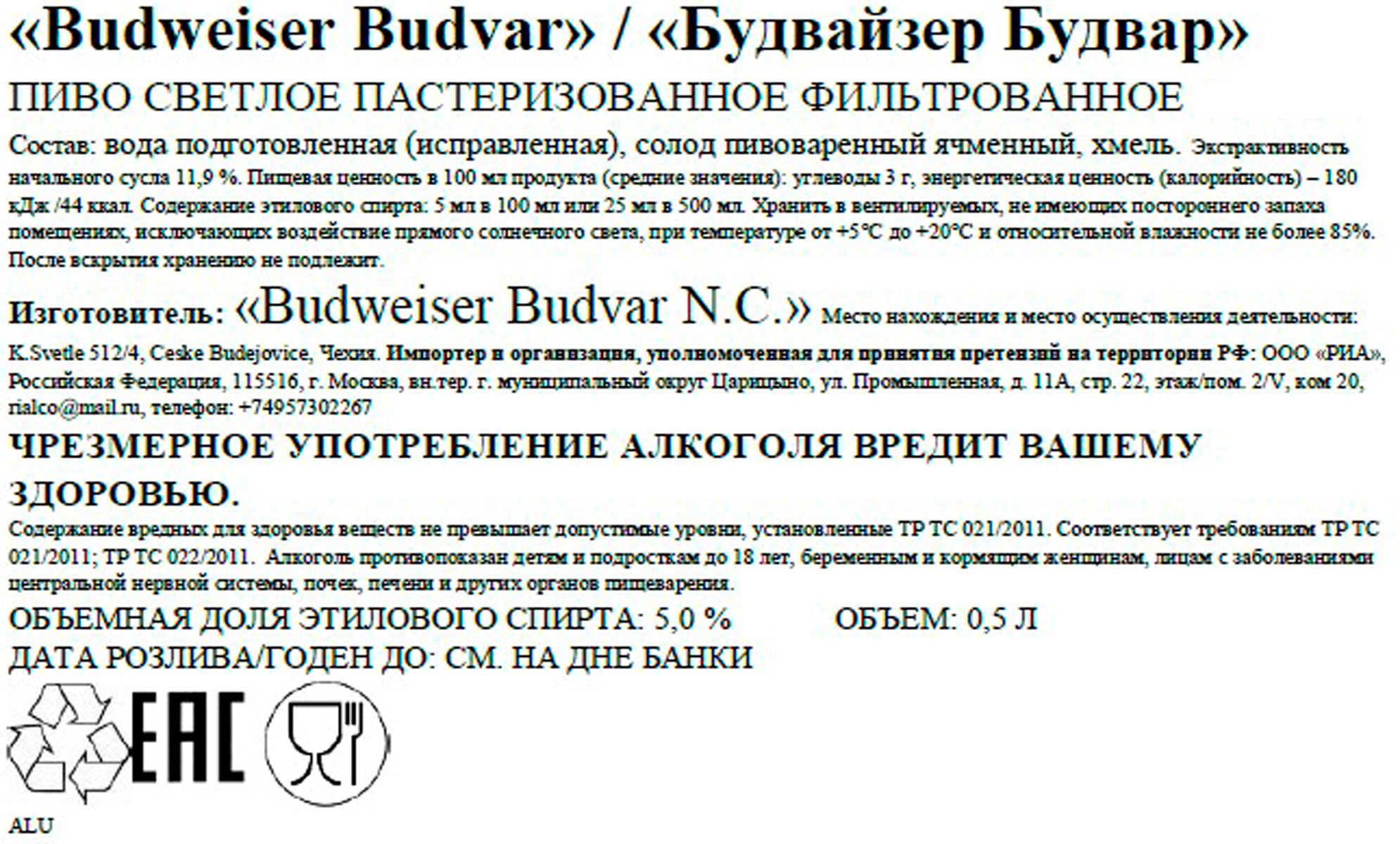 Budweiser Budvar — светлый лагер, хорошо известный всем любителям хорошего пива. Варится с 1895 года. Его уникальность гарантирована не только высококачественными ингредиентами — великолепным ячменным солодом, жатецким хмелем и уникальной природной водой из глубоких артезианских скважин, но и длительным временем созревания в погребах в лагерных танках в течение 90 дней. Вкус пива получается освежающим, гладким, с хорошо сбалансированными сладковатыми нотами солода и хмелевой горчинкой.