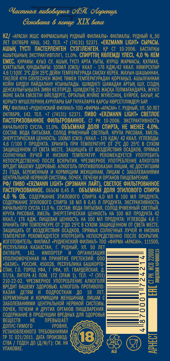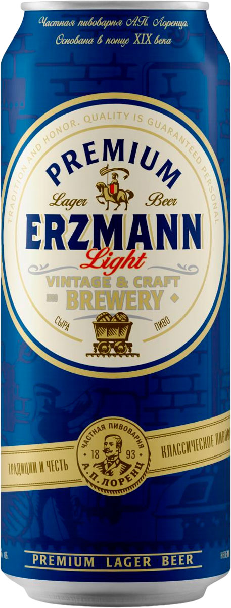 Erzmann Light пропитано ароматом рыцарского благородства. Классический светлый лагер. Легкое пиво с мягким вкусом и тонким хмельным ароматом. Пиво проходит «мягкую» фильтрацию с минимальным количеством дрожжей, что придает напитку прозрачный, золотистый цвет и легкий, мягкий вкус.