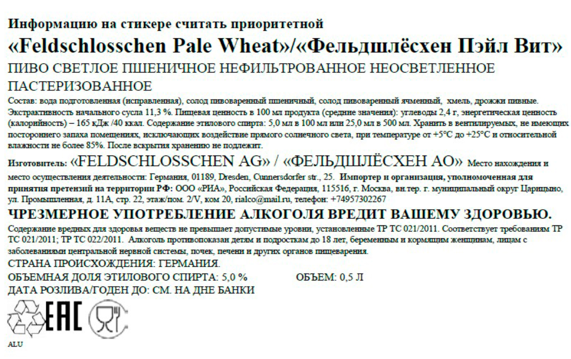 Пиво Фельдшлёсхен Пэйл Вит пшеничное светлое нефильтрованное ж/б