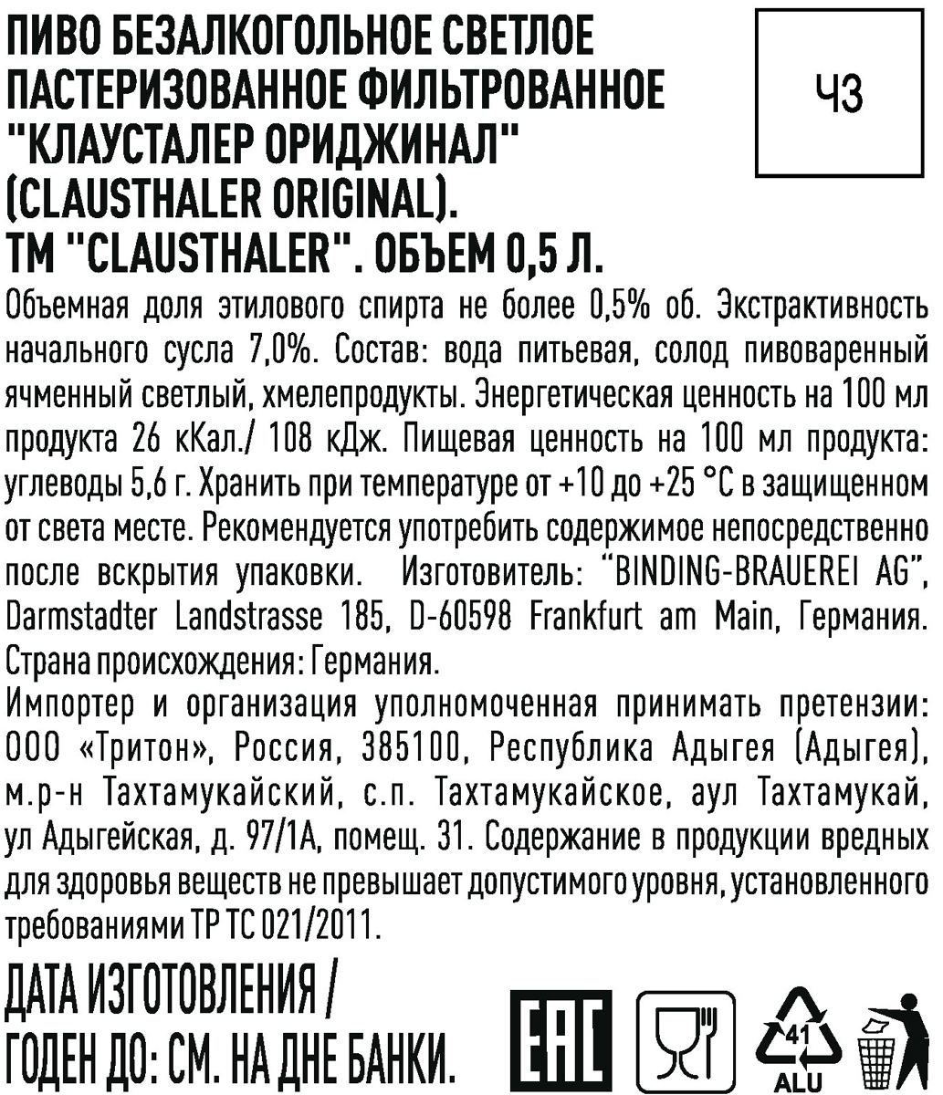 Пиво Клаусталер Ориджинал светлое пастеризованное фильтрованное безалкогольное ж/б