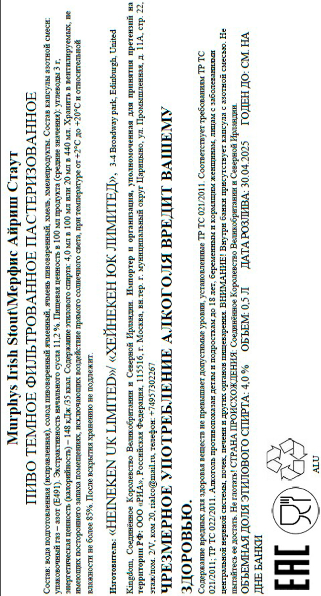 Пиво Мерфис Айриш Стаут темное фильтрованное пастеризованное ж/б