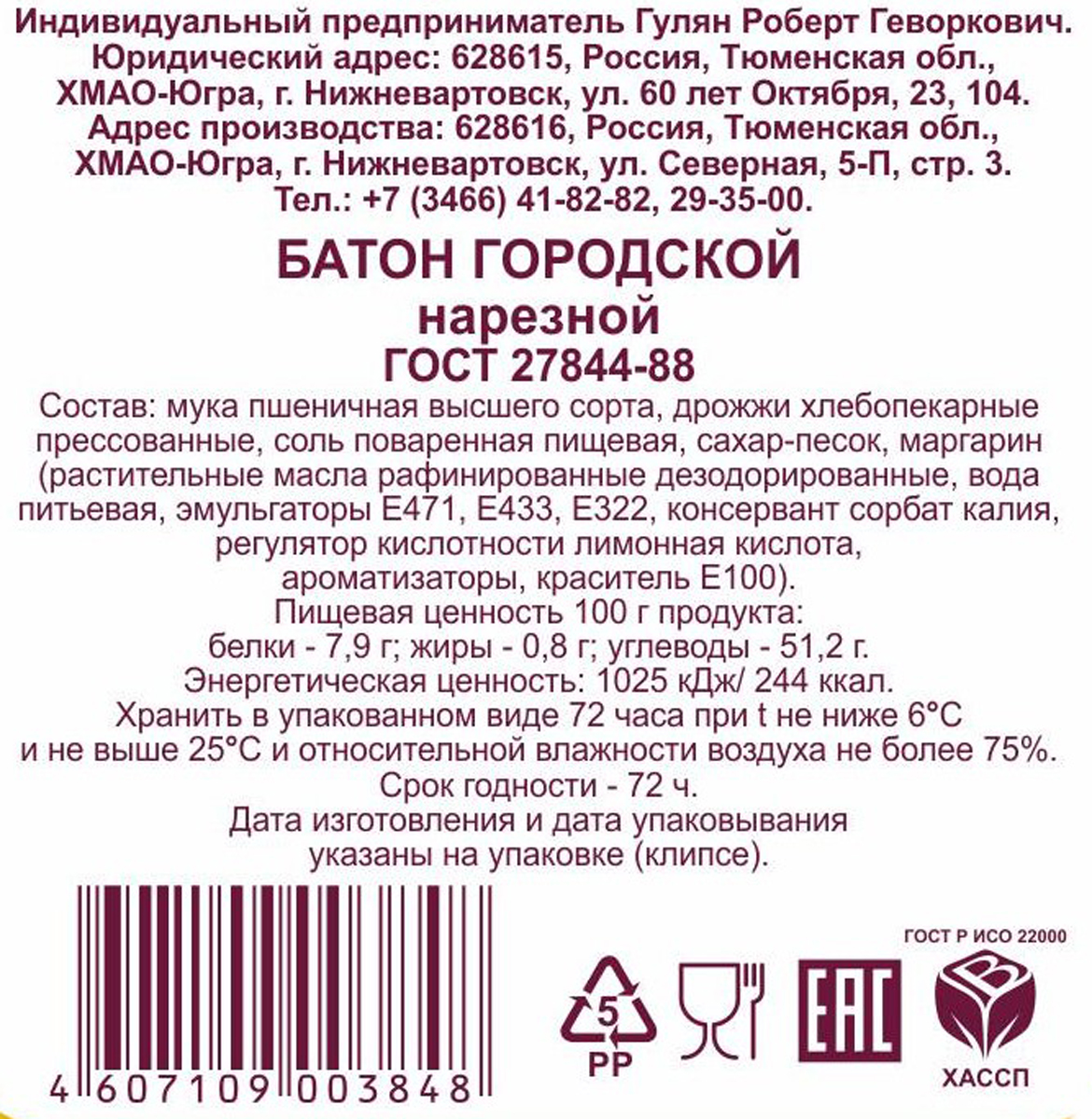 Батон Самотлор Хлеб Городской нарезка