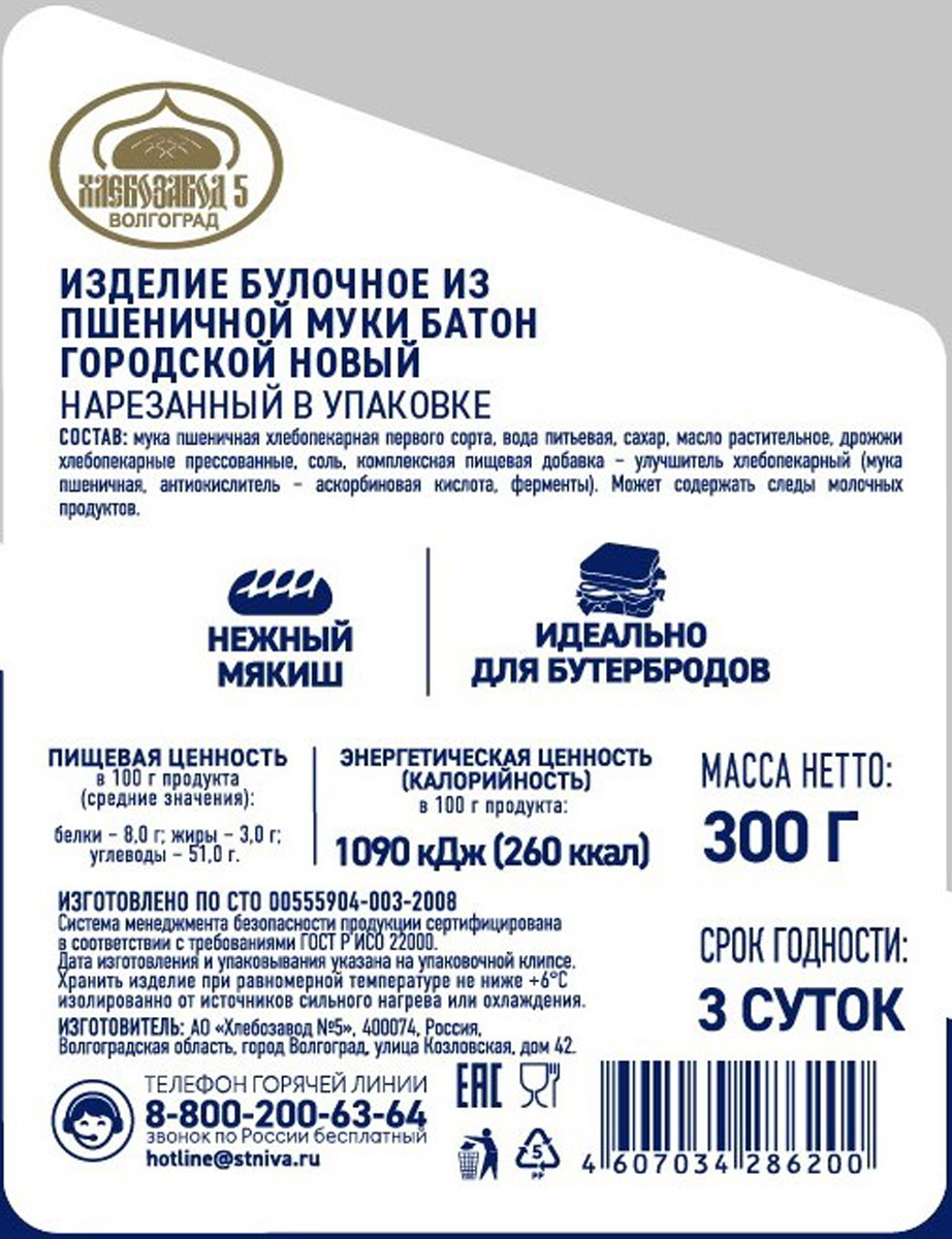 Батон Хлебозавод №5 Городской нарезка 300 г