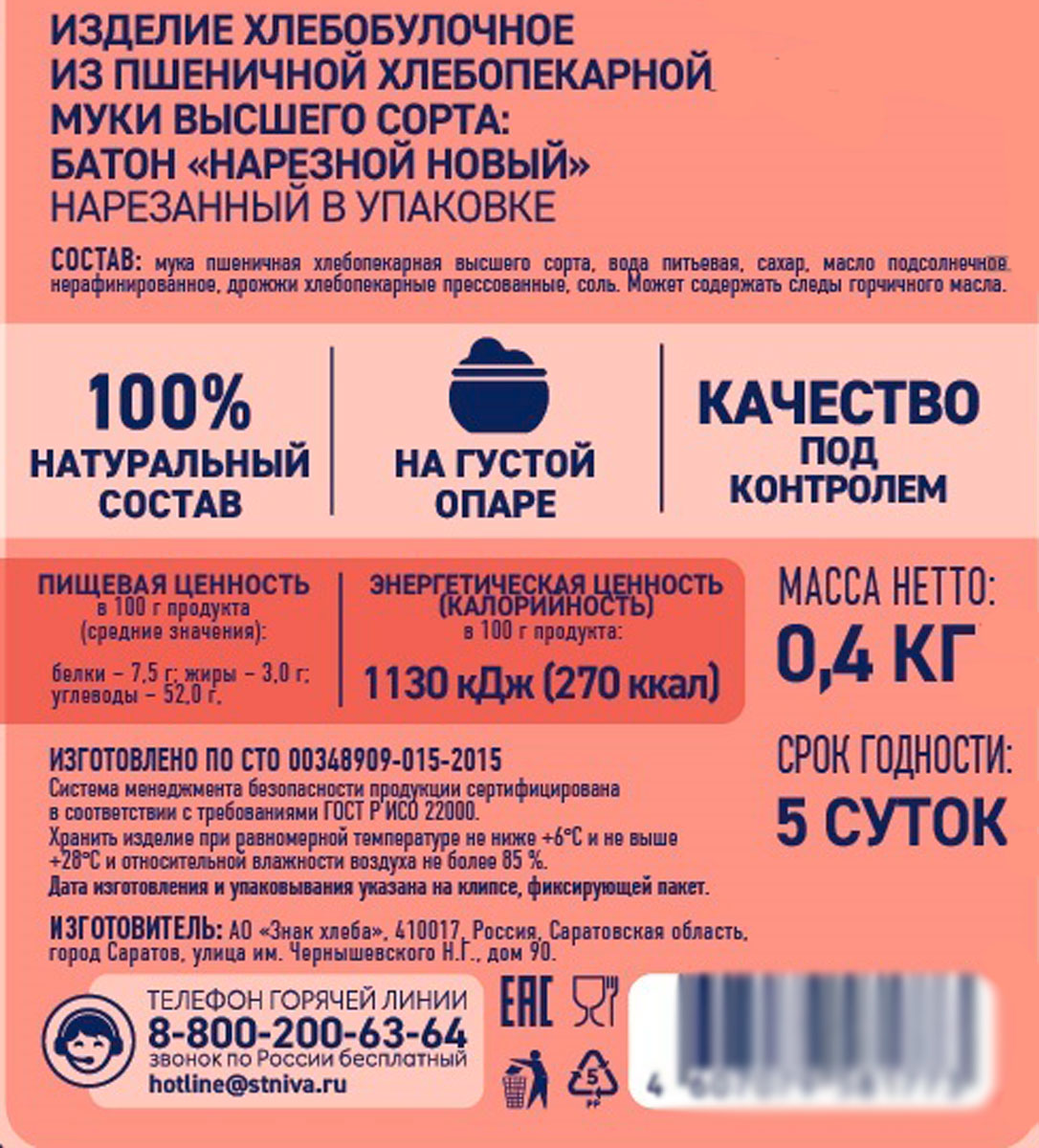Классический нарезной батон из муки высшего сорта, разделенный на порционные кусочки. Натуральное хлебобулочное изделие с плотной румяной корочкой и упругим светлым мякишем имеет приятный аромат выпечки и сбалансированный вкус. Продукт универсален в применении: отлично подходит для приготовления горячих и холодных бутербродов, сухарей и тостов.