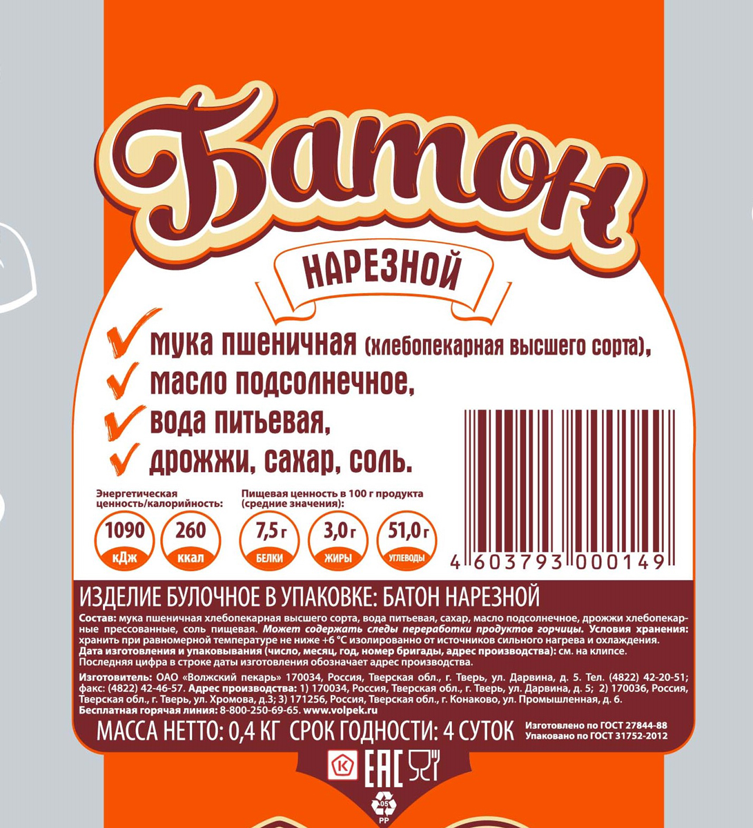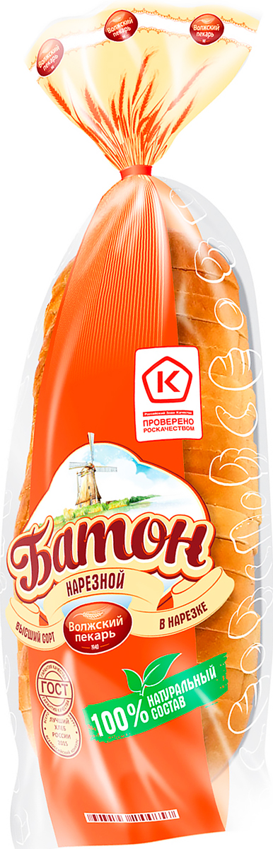Батон Волжский пекарь нарезной нарезка