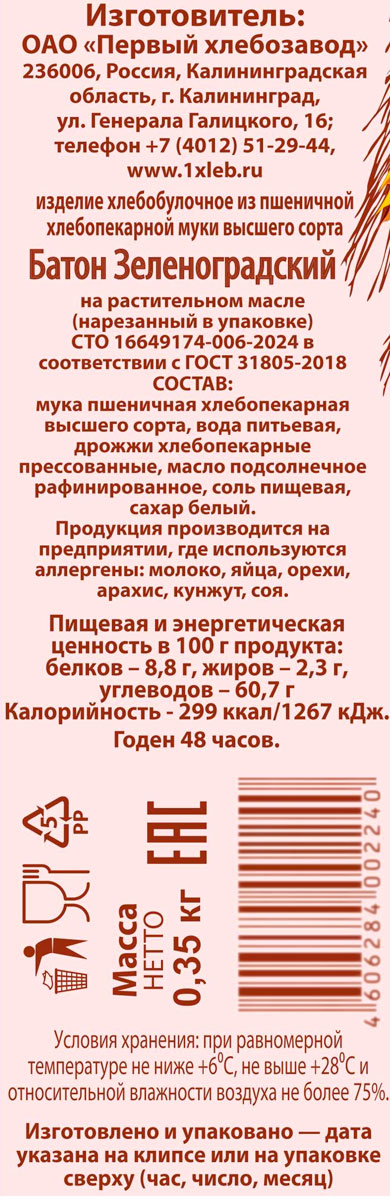 Батон Зеленоградский нарезка Первый ХЗ