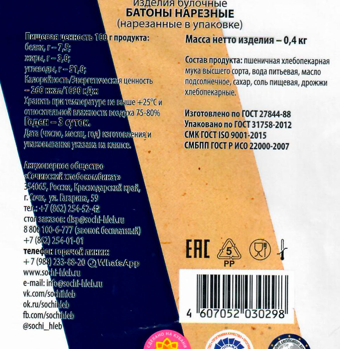 Батон Сочинский ХК нарезной нарзка 400 г