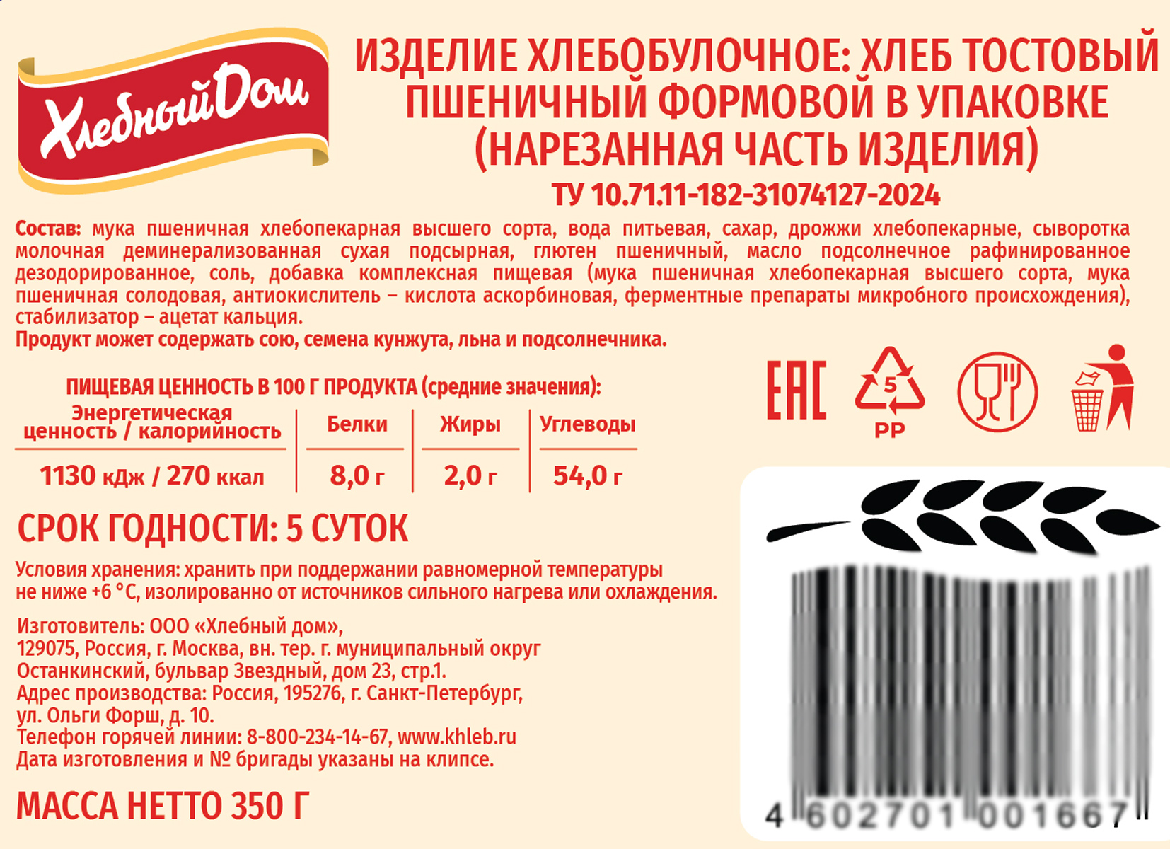 Хлебный Дом Тостовый пшеничный хлеб