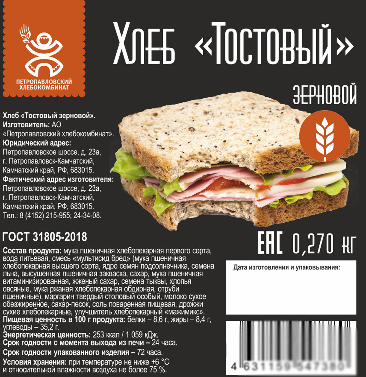 Хлеб Тостовый зерновой Петропавловский ХК