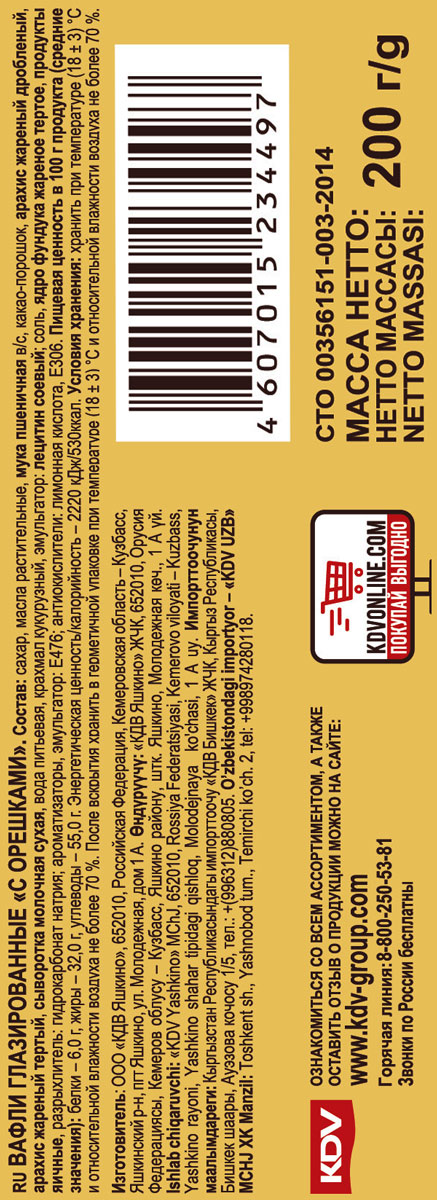Семислойные вафли с начинкой из натурального какао и дробленого фундука. Вафли посыпаны измельченным арахисом и покрыты нежной глазурью.