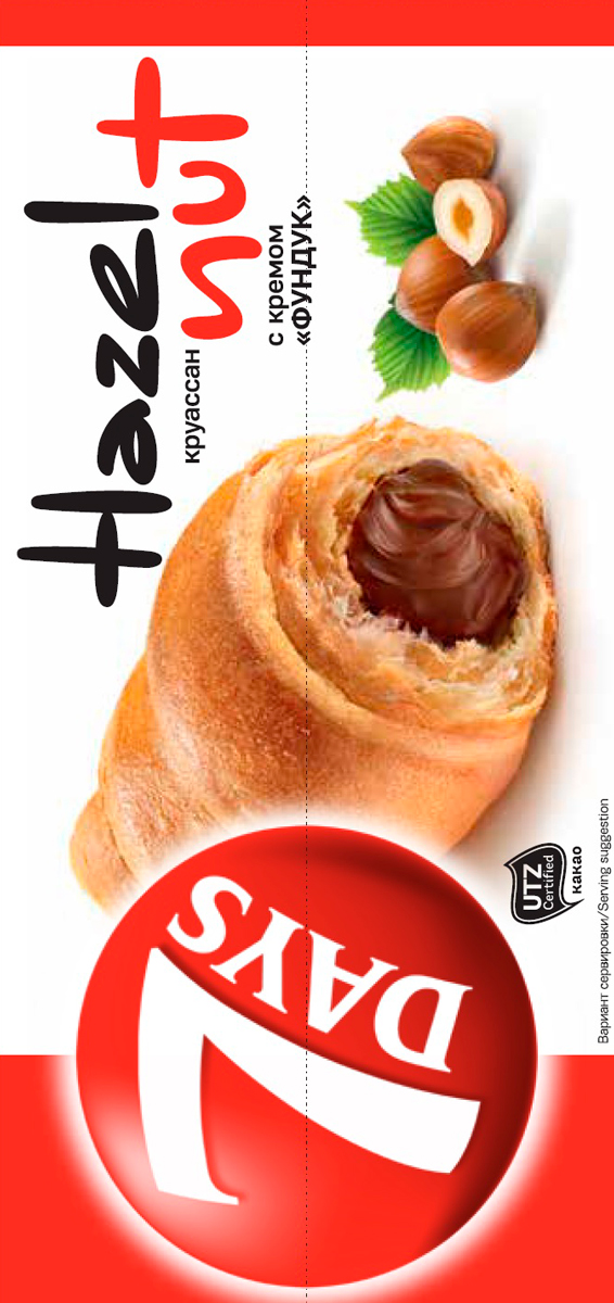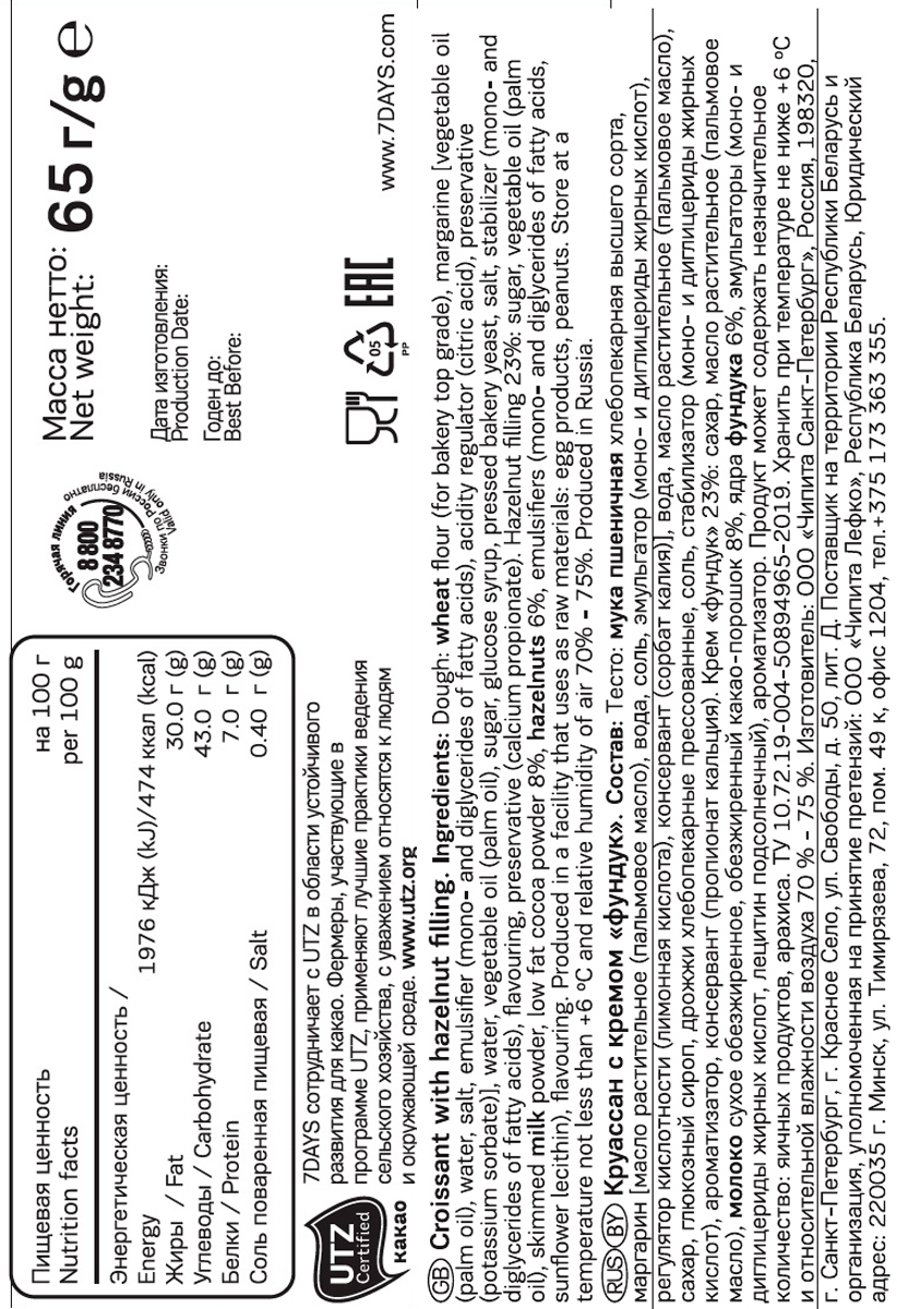 Для приготовления круассана 7DAYS c кремом фундук использованы только отборные орехи самого высокого качества и какао, сертифицированное по системе UTZ. Поставщики, участвующие в программе UTZ, применяют лучшие практики ведения сельского хозяйства, с уважением относятся к людям и окружающей среде. Круассан 7DAYS — это питательная порция выпечки, наполненная кремовой или джемовой начинкой. Он удобно упакован и готов к употреблению. Великолепный дуэт воздушного слоёного теста и нежной начинки подарит вам энергию на весь день. Утолите чувство голода и получите настоящее удовольствие от перекуса: круассан 7DAYS сделает ваш день восхитительным!