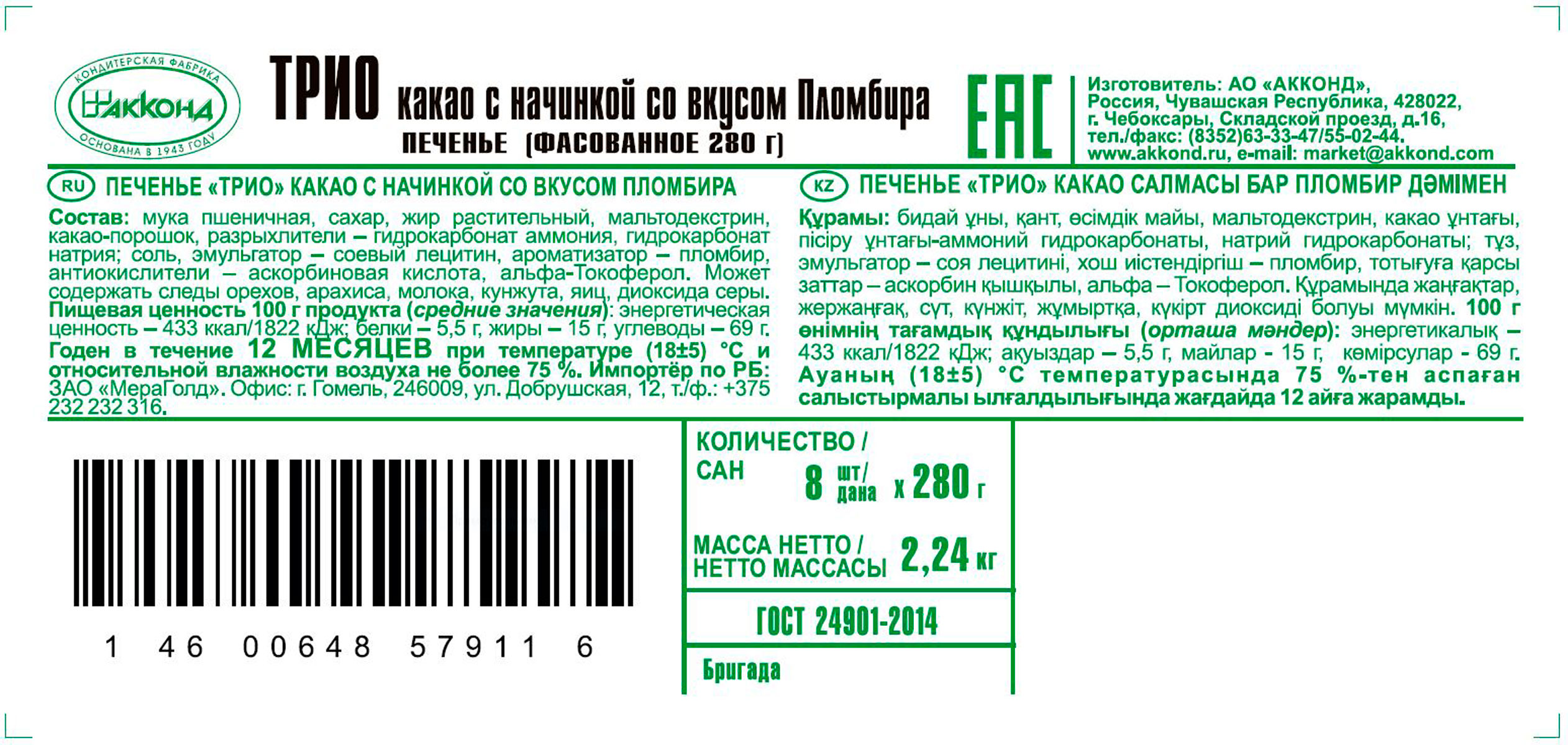 «Трио» — оригинальное трехслойное печенье, сочетающее темное хрустящее печенье и кремовую начинку со вкусом классического пломбира, изготовленную из натурального молока.