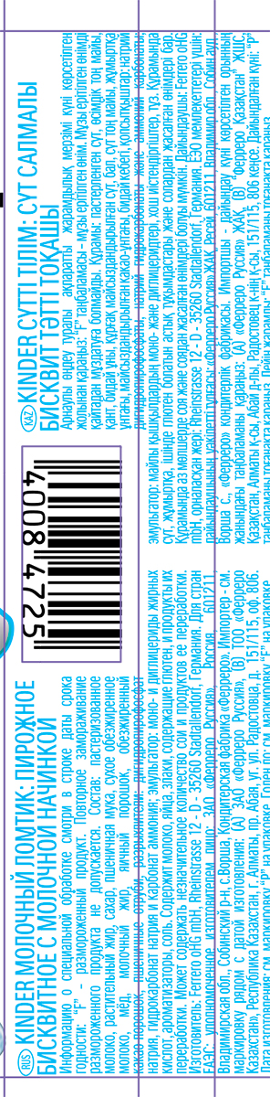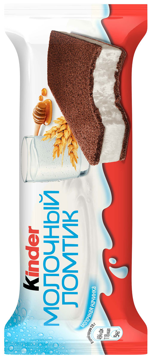 Kinder «Молочный Ломтик» — пирожное из тонкого бисквита с молочной начинкой и добавлением меда и злаков. Это охлажденный продукт, изготовленный по инновационным технологиям с большим содержанием молока (до 40%). При комнатной температуре Kinder Молочный Ломтик хранится только несколько часов, поэтому обязательно храните его в холодильнике. Kinder Молочный Ломтик — вкусное дополнение к завтраку!