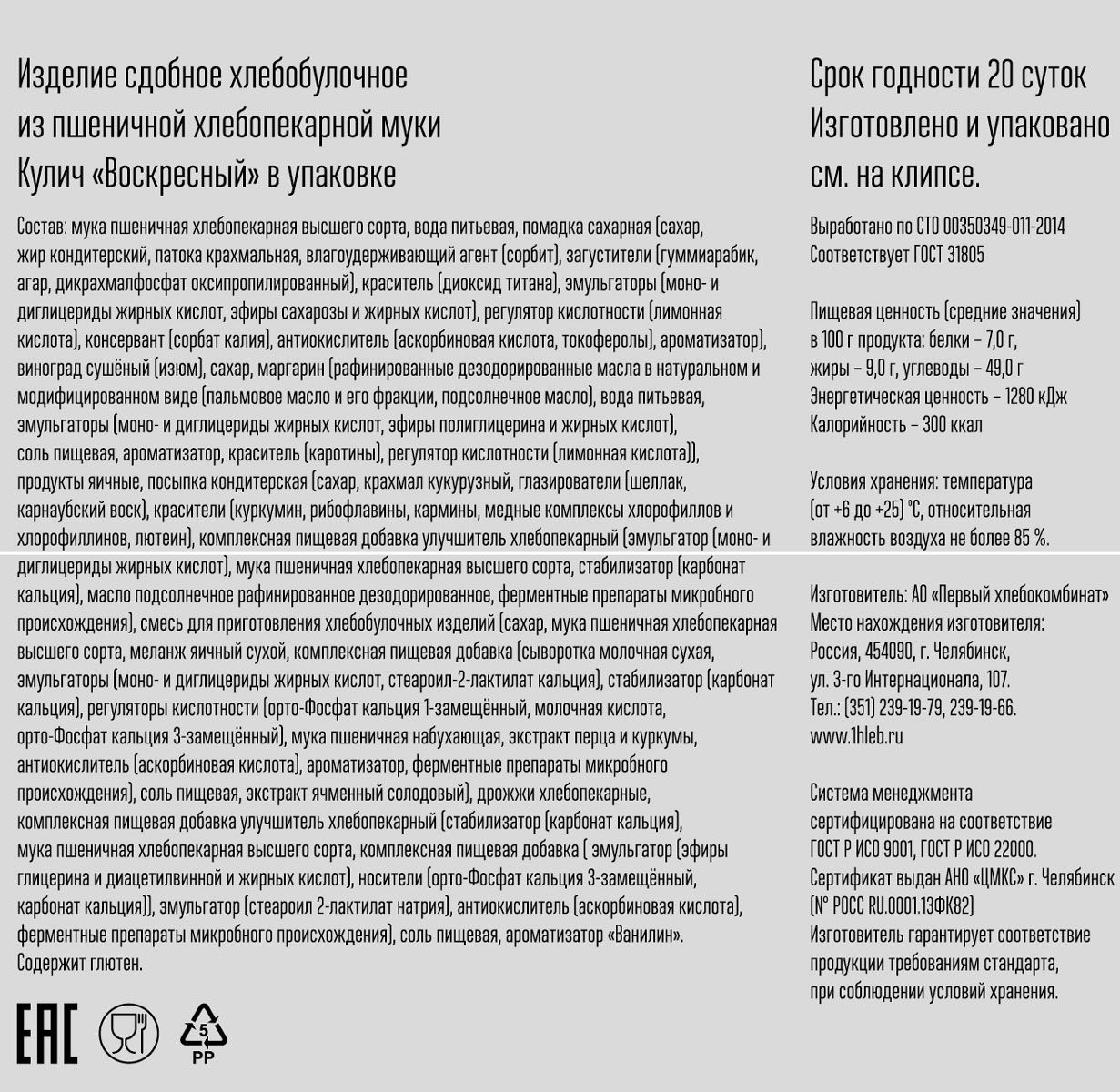 Невероятно вкусный кулич. Мягкий, пышный, очень сладкий и много изюма . Давно таких не попадалось в продаже. Хлебозавод Челябинска явно не пожадничал с продуктами.