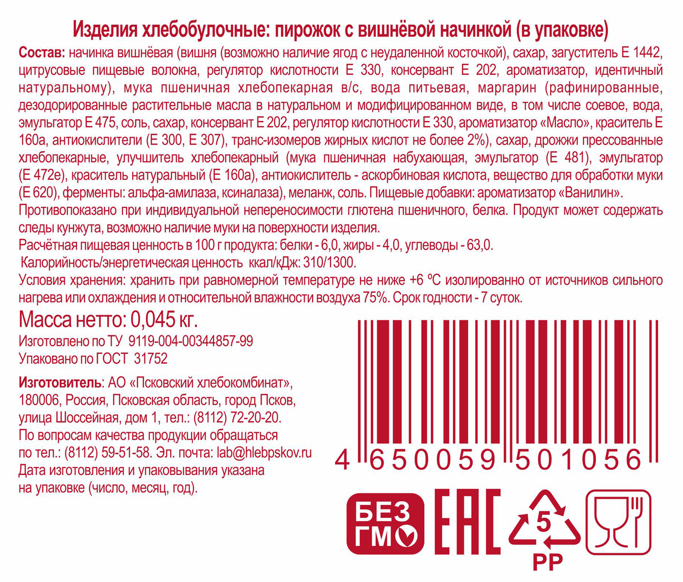 Псковский Хлебокомбинат пирожок с вишней