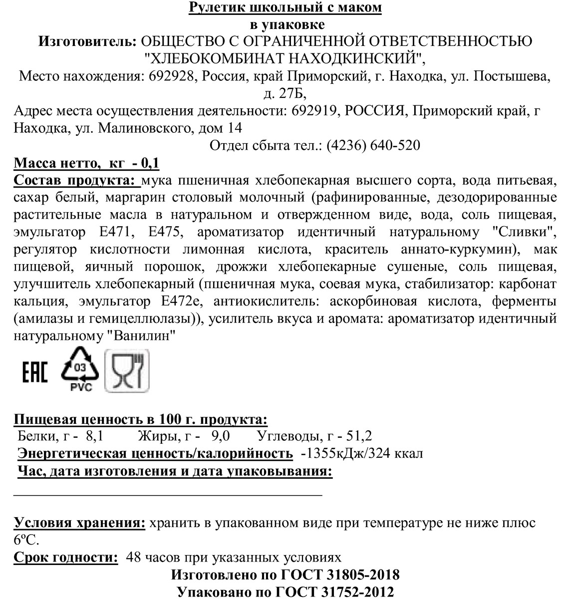 Рулетик школьный с маком Находкинский ХК