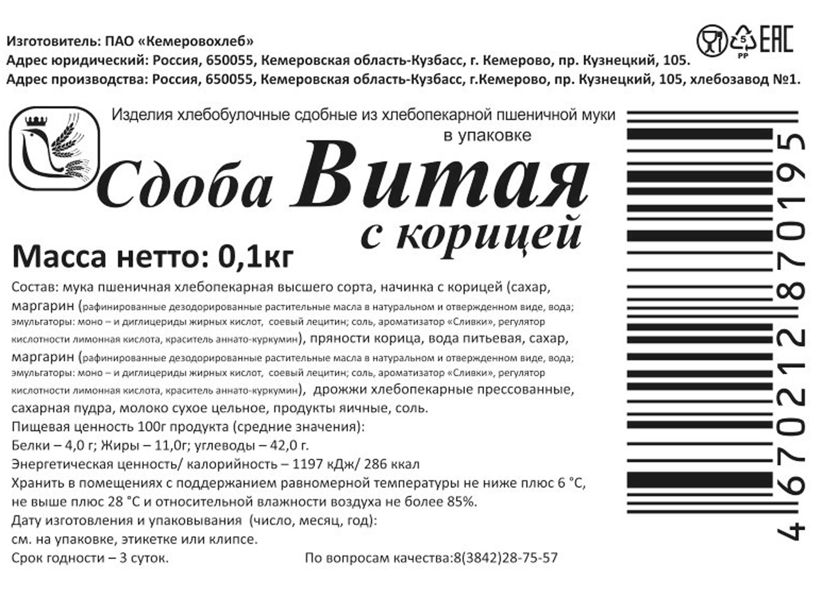 Сдоба витая Кемеровохлеб с корицей 100 г