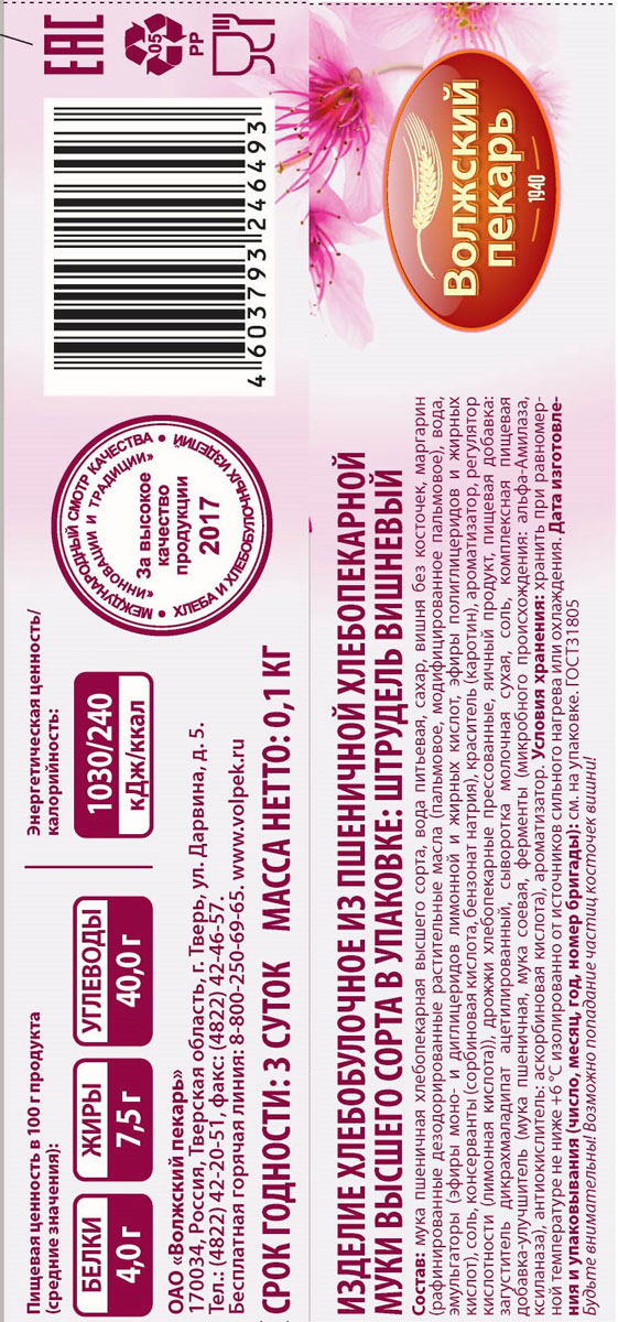 Штрудель Волжский пекарь вишневый