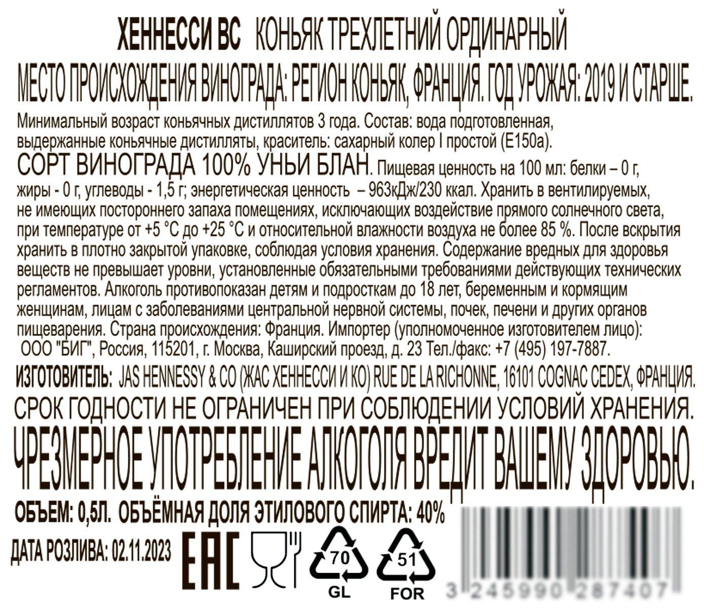 Коньяк Хеннесси ВС 0,5 л