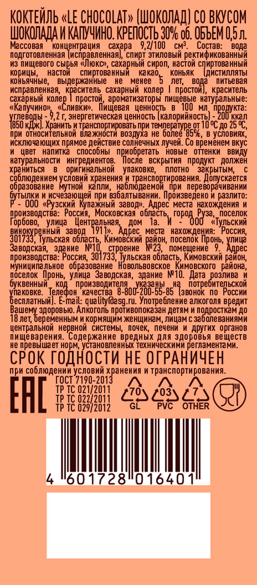 Изысканный коньячно-шоколадный дижестив со вкусом капучино и шоколада Le Chocolat создан на основе выдержанных коньячных спиртов, в сочетании с натуральными настоями кофе и какао-бобов. Бархатистый, мягкий и сладковатый вкус коктейля с выраженными нотами капучино и шоколада обладает более низким содержанием алкоголя, чем в классическом коньяке и сливочным послевкусием. Коктейль рекомендуется подавать в качестве дижестива, сочетать с мясными блюдами, шоколадом или десертами.
