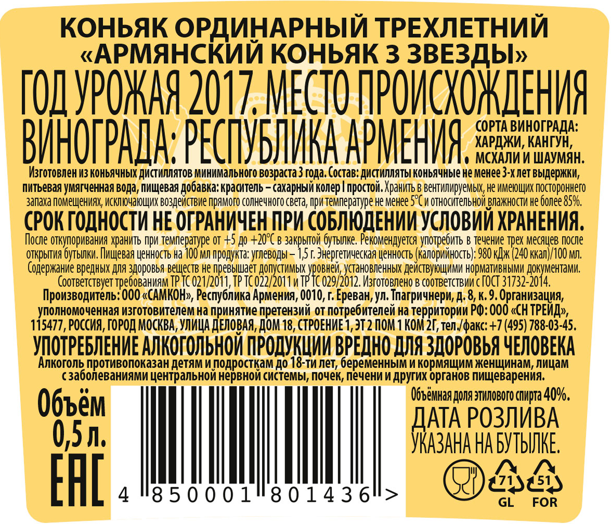 Армянский коньяк — это крепкий напиток медово-янтарного цвета. Элегантный аромат наполнен нотами кураги, грецкого ореха, шоколада, карамели, специй. Коньяк имеет сбалансированный мягкий вкус с оттенками пряностей, сухофруктов и гармоничным округлым послевкусием. Рекомендуется подавать при температуре +16°С - +18°С в качестве дижестива, а также в сочетании с изысканными шоколадными сладостями.