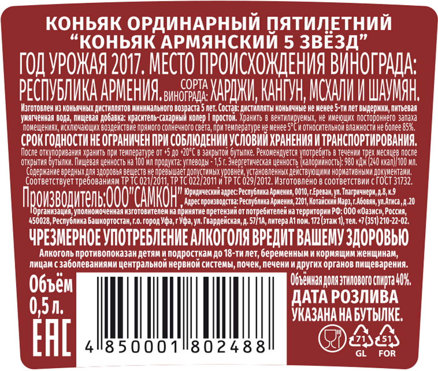 Коньяк Армянский 5 звезд 0,5 л
