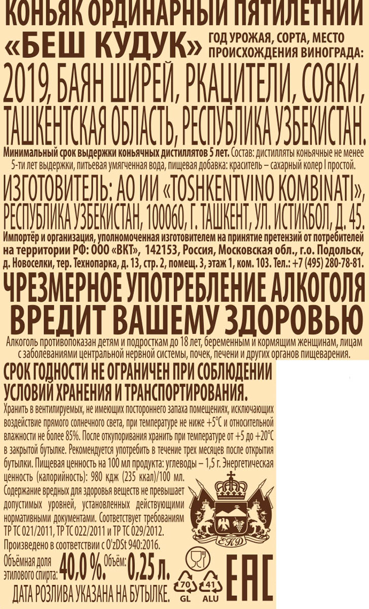 Коньяк Беш Кудук 5 звезд 0,25 л
