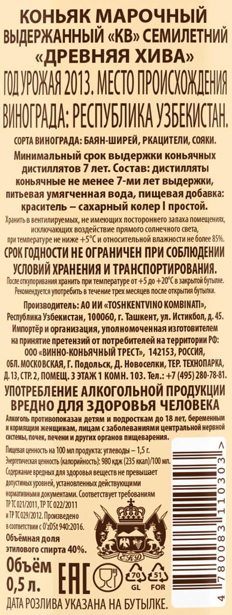 Покупали и с удовольствием пили этот коньяк на протяжении более 10 лет. Но последняя покупка крайне разочаровала. Ничего общего с прежней «Хивой». Очень жаль. Непонятно на каком этапе произошла подделка