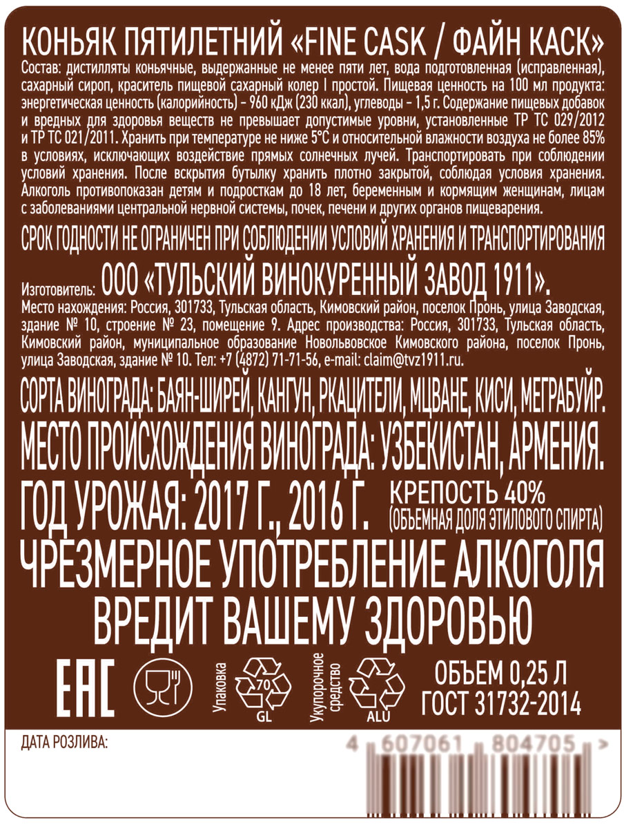 Заболела голова через час после приема этого чуда-напитка (150гр.) Взял по совету продавца 0,25л. Больше брать не буду тульский "новичок". Забавно - тульский коньяк из грузинского винограда ???