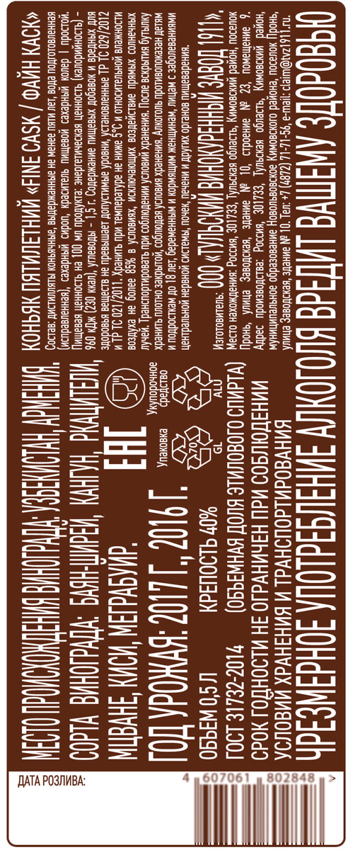 Заболела голова через час после приема этого чуда-напитка (150гр.) Взял по совету продавца 0,25л. Больше брать не буду тульский "новичок". Забавно - тульский коньяк из грузинского винограда ???