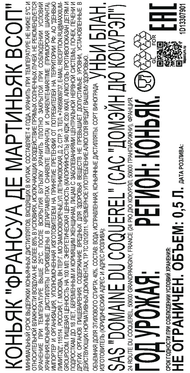 Коньяк Франсуа де Мартиньяк ВСОП п/к 0,5 л