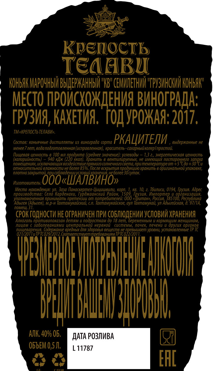 Коньяк «Крепость Телави» насыщенного янтарного цвета производится из спиртов, дистиллированных из винограда сорта Ркацители и выдержанных не менее семи лет в дубовых бочках. В аромате присутствуют нежные виноградные тона и яркие ванильные ноты. Вкус гармоничный, с приятными плодовыми оттенками.