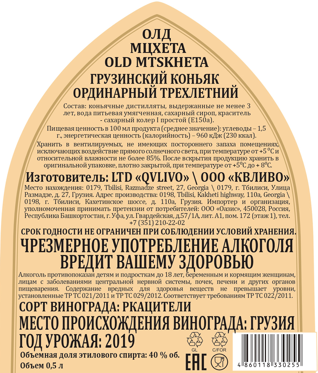 Коньяк грузинский Олд Мцхета 3 года 0,5 л