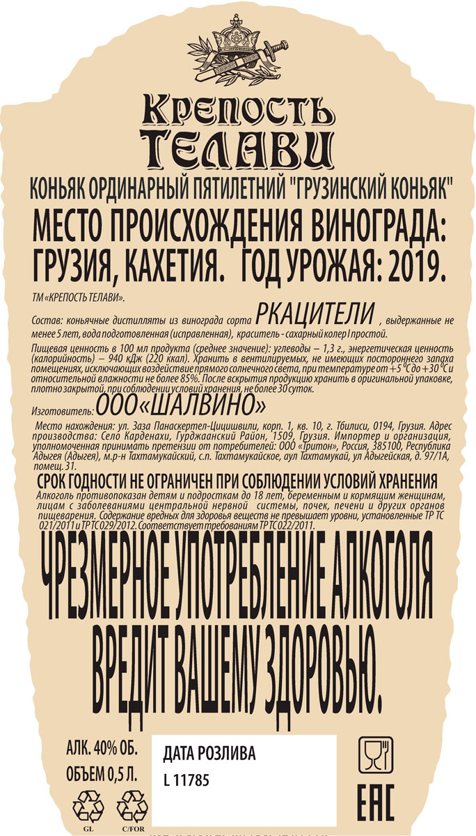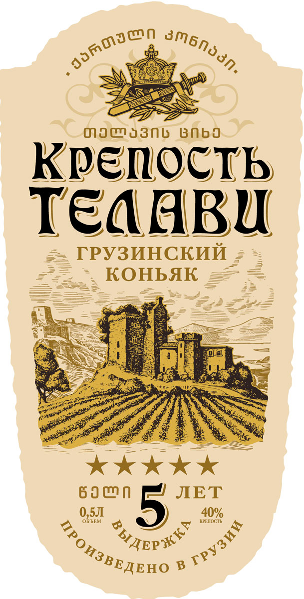Коньяк «Крепость Телави» золотисто-янтарного цвета производится в Грузии из специально отобранных сортов винограда. Полученные спирты выдерживаются в отборных дубовых бочках не менее 5 лет. Обладает насыщенным цветочным ароматом с приятными тонами шоколада и оттенками миндаля и меда.