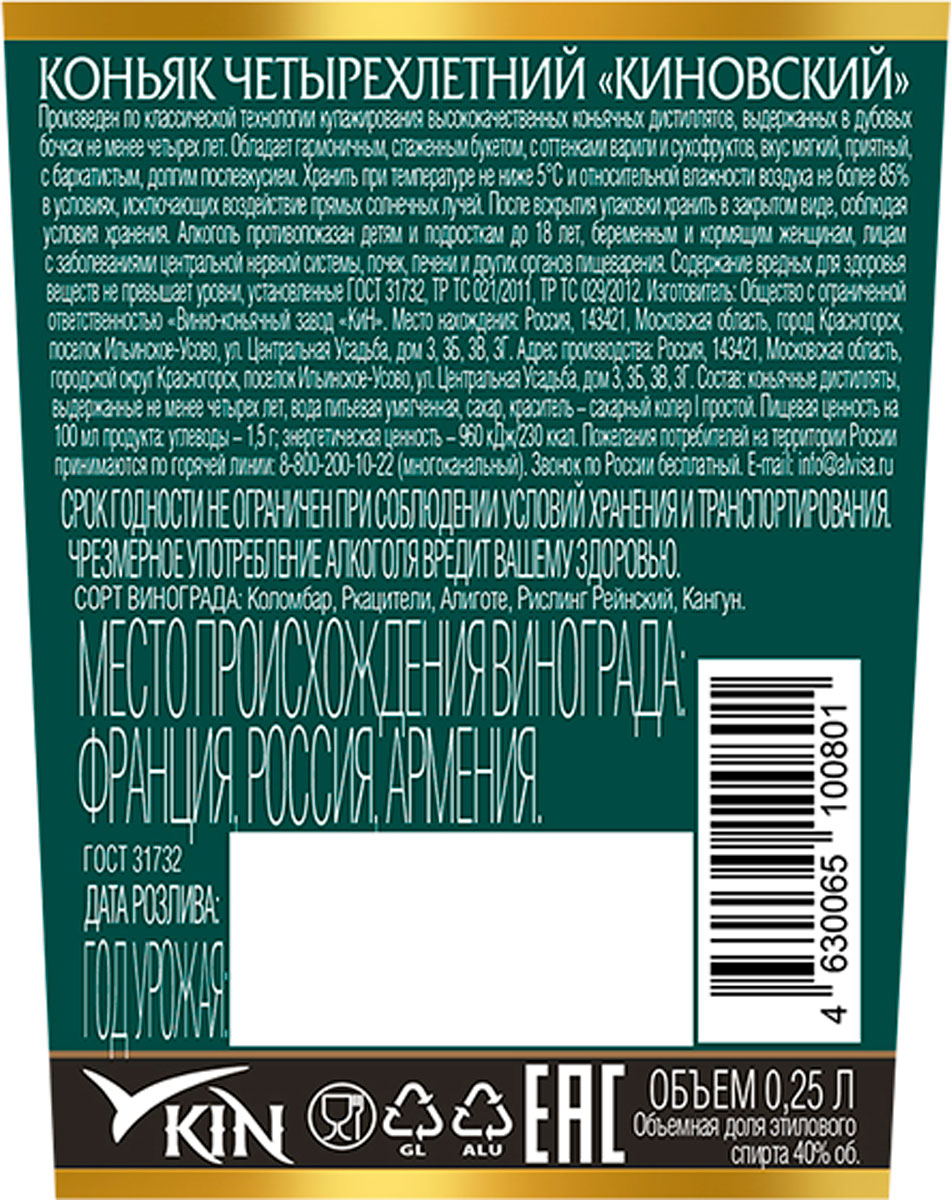 Коньяк четырехлетний «Киновский». Произведен по классической технологии купажирования из высококачественных коньячных дистиллятов, выдержанных в дубовых бочках не менее четырех лет. Обладает ярким, выразительным букетом, особо мягким округлым вкусом и утонченным продолжительным послевкусием.