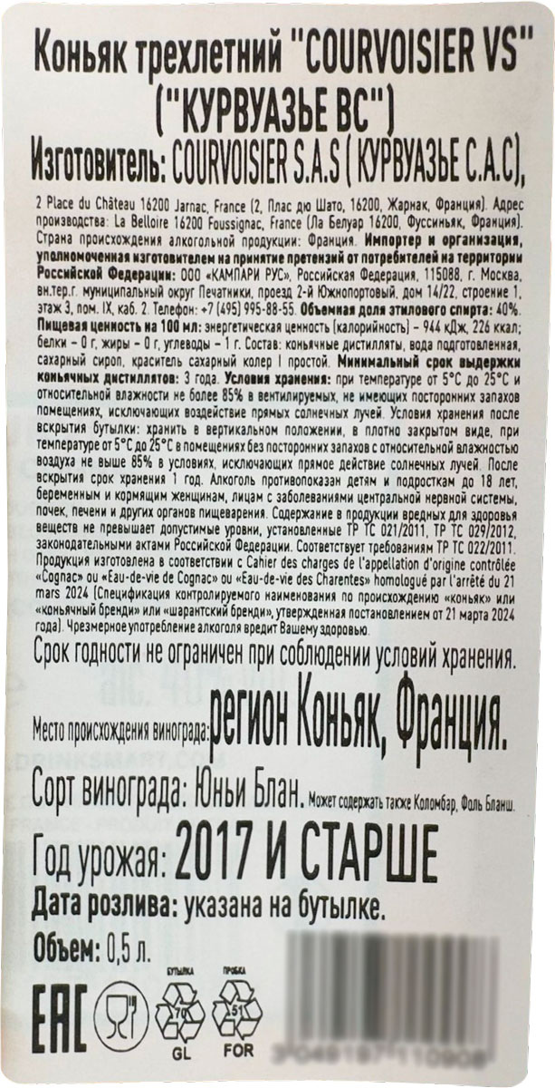 История коньячного дома Courvoisier насчитывает более 200 лет. За это время небольшое предприятие недалеко от Парижа выросло в авторитетного производителя с мировым именем. Courvoisier VS — превосходный выбор для тех, кто только начинает свое знакомство с благородными крепкими напитками. Коньяк имеет приятный золотистый цвет, тонкий вкус с букетом, переполненным зрелыми фруктами и весенними цветами. Напиток обладает богатым и гармоничным ароматом. Коньяк Courvoisier VS прекрасен в чистом виде, а также отлично подходит для приготовления коктейлей.