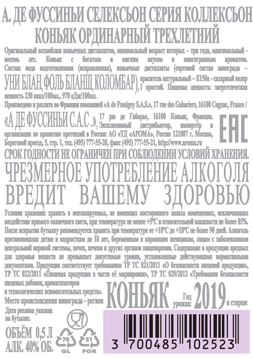 Коньяк А.ДЕ Фуссиньи Селексьон Коллексьон туба