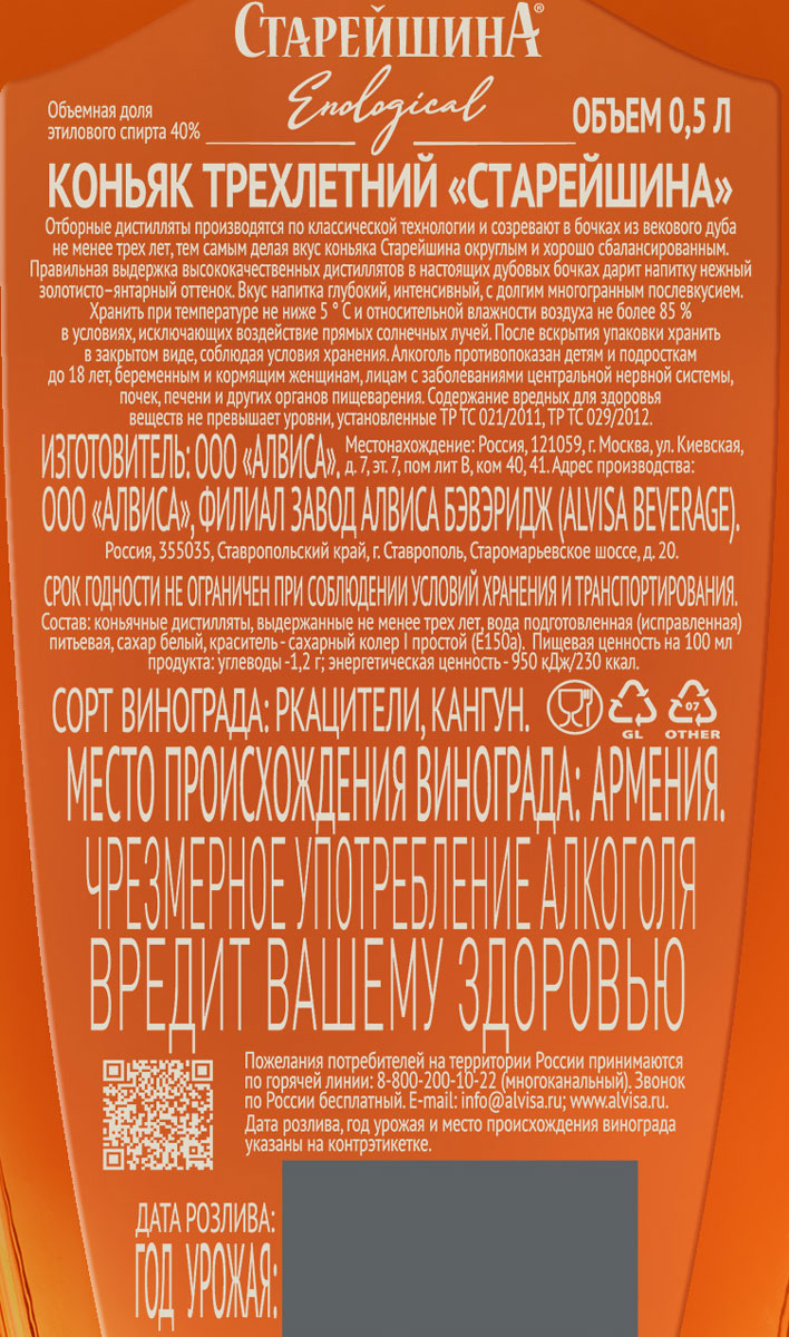 Классный коньяк! Пью его уже довольно давно. Никогда не было нареканий по качеству. Качество отменное! Рад что теперь он появился "Красном и Белом" возле моего дома, теперь далеко ходить не нужно). Считаю существенным плюсом, что "Старейшина" является экологическим коньяком. Прочитал в интернете, что это значит, что продукт полностью натуральный, и содержание вредных веществ в нём сведено до минимума. В наше время, когда многие продукты пичкают разной химозой, это очень актуально. Так что, спасибо "Красному и Белому" за то что даёт нам, потребителям, возможность покупать качественные натуральные напитки, такие, как коньяк "Старейшина"!