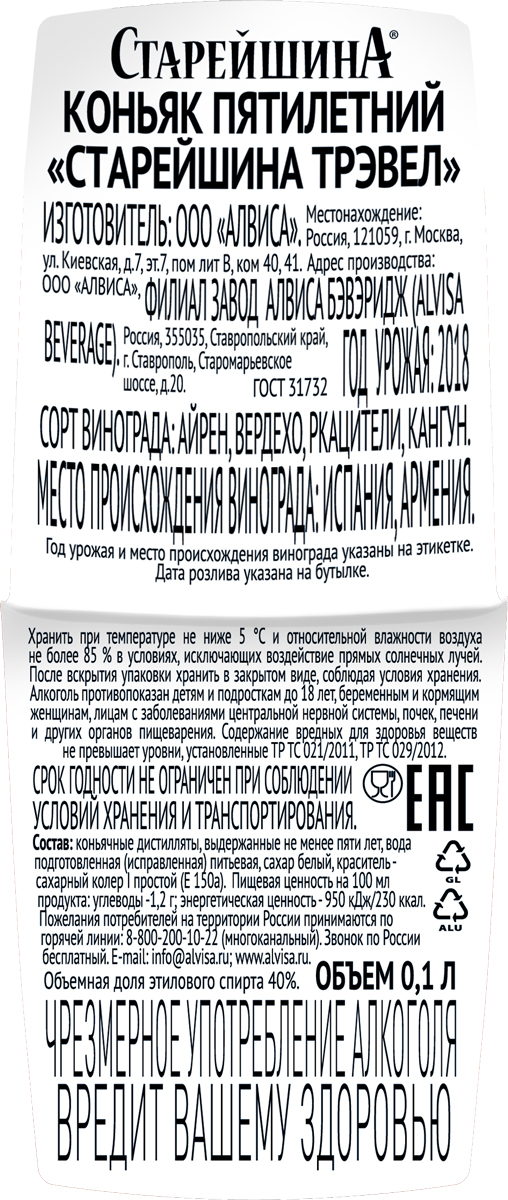 Коньяк Старейшина 5 лет 0,1 л